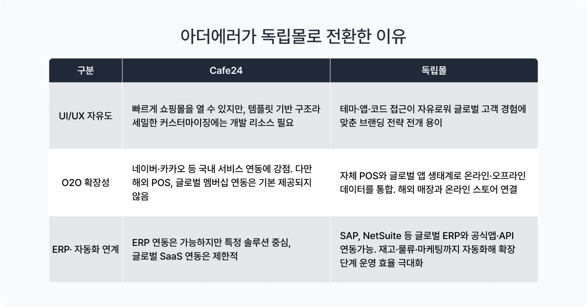 아더에러가 카페24에서 독립몰로 전환한 이유는 단순한 기능 차이가 아닙니다. 브랜드가 성장 단계에서 글로벌 확장성과 표준화된 인프라를 필요로 했기 때문입니다.