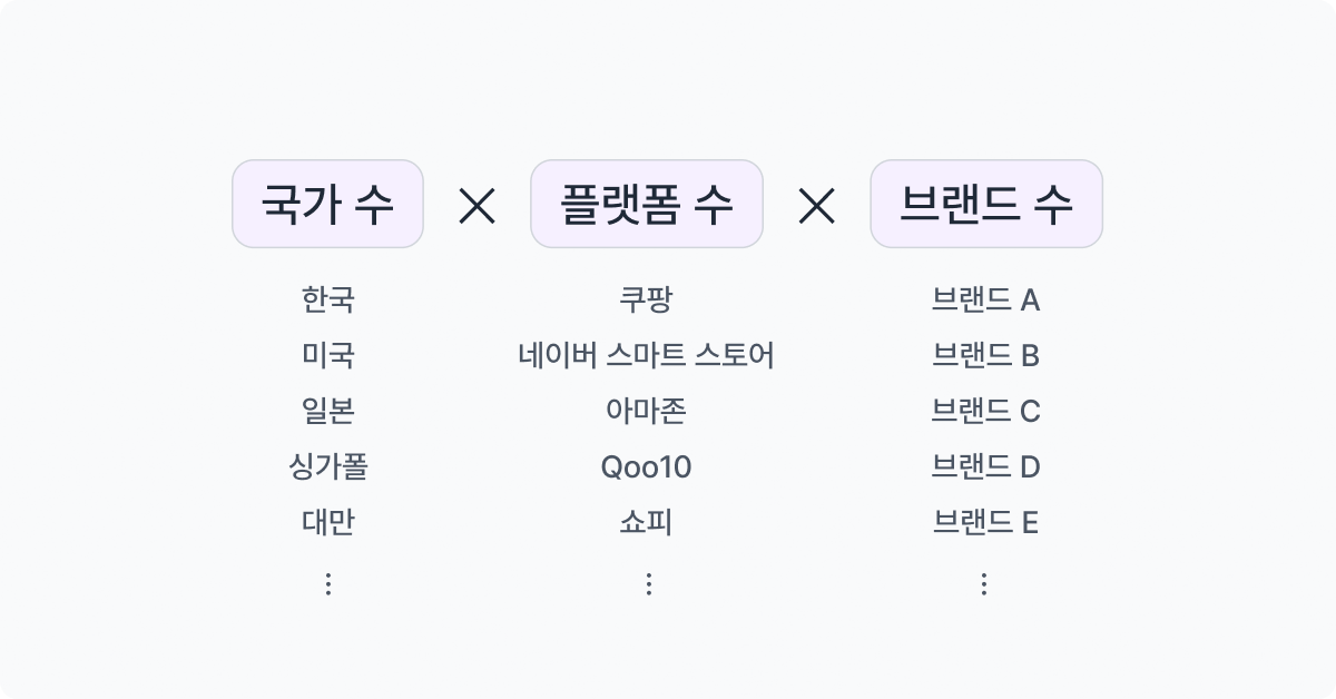 문제는 이 과정이 국가·플랫폼·브랜드 조합만큼 반복된다는 점입니다. 예를 들어 한국, 미국, 일본 3개국에서 쿠팡·아마존·Qoo10 3개 플랫폼에 입점하고, 2개 브랜드(기초/색조 화장품)를 운영한다면? 무려 18번의 동일 작업이 필요합니다.