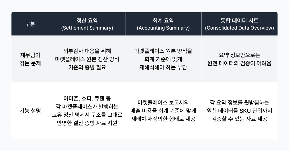 그래서 단순히 “마켓플레이스 숫자를 그대로 보여주는 것”이 아니라, “그 숫자를 회계 기준에서 다시 해석할 수 있는 구조”가 필요하다고 판단했습니다.