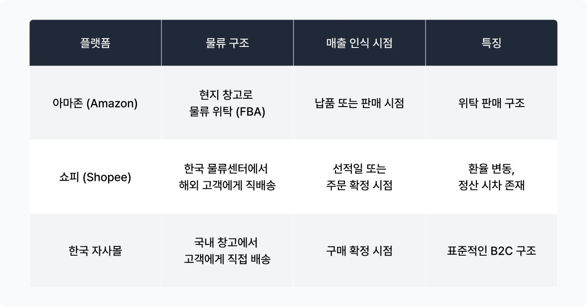스킨1004는 글로벌 확장 이후 이 문제를 가장 직접적으로 마주한 브랜드 중 하나입니다. 국내 자사몰을 넘어 Shopee(동남아), Amazon(미국·유럽) 등으로 판매 채널을 넓히면서 물류 흐름과 정산 구조가 한층 복잡해졌기 때문입니다. 이에 따라, 스킨1004 재무•회계팀의 관심사는 ‘얼마를 벌었는가’에서 ‘어느 시점을 기준으로 매출을 인식해야 하는가’로 확장됐습니다.
