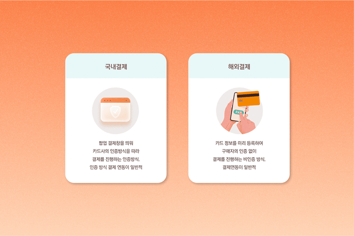 결제를 연동하는 방식은 크게 인증 방식과 비인증 방식으로 나뉘는데요. 국내 결제 환경이 인증 방식 결제 연동에서 최근 들어 비인증 방식 결제 연동으로 변하는 추세라면, 해외 결제 환경은 처음부터 비인증 방식 결제 연동이 주를 이뤘습니다.