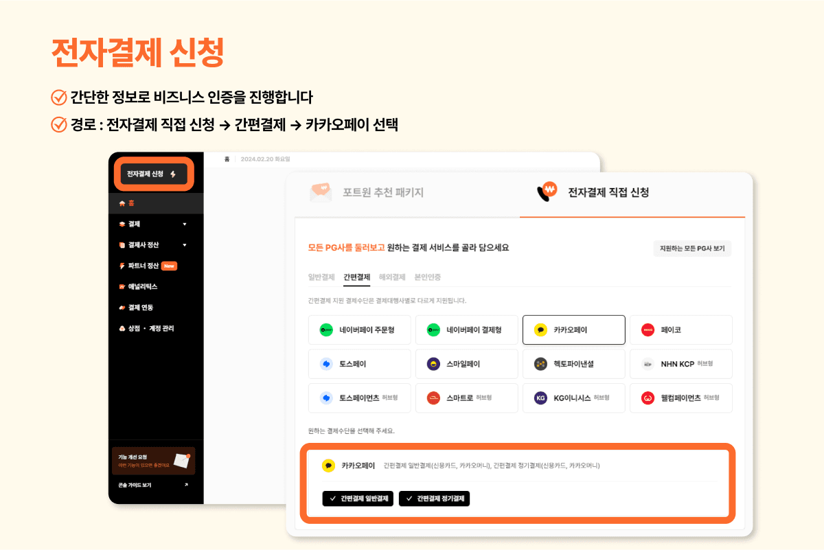 전자결제 신청 > 비즈니스인증 > 전자결제 직접신청 > 간편결제 > 카카오페이 선택