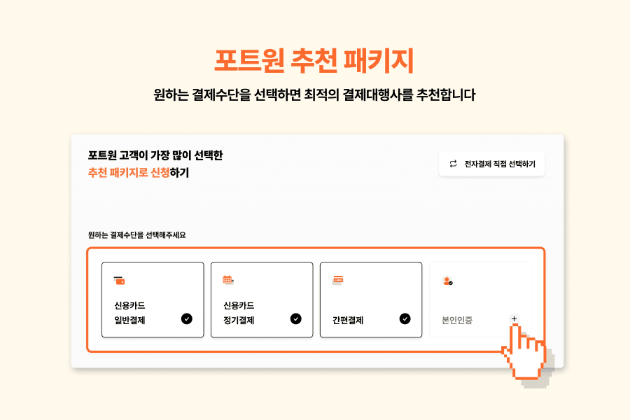 포트원은 온라인 서비스를 운영 중인 기업이 가장 많이 사용하는 결제수단을 제안합니다. 결제수단을 기반으로 결제 대행사 이용 비용, 결제 형태와 연동방식을 종합적으로 고려하여 딱 맞는 결제대행사를 추천해 드립니다.