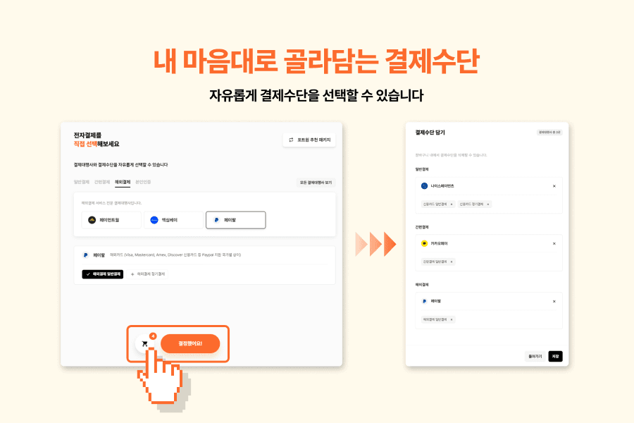 특정 결제수단과 결제대행사 이용을 원한다면, [전자결제 직접 신청하기]를 통해 원하는 결제 수단별 결제 대행사를 골라 담을 수 있습니다.