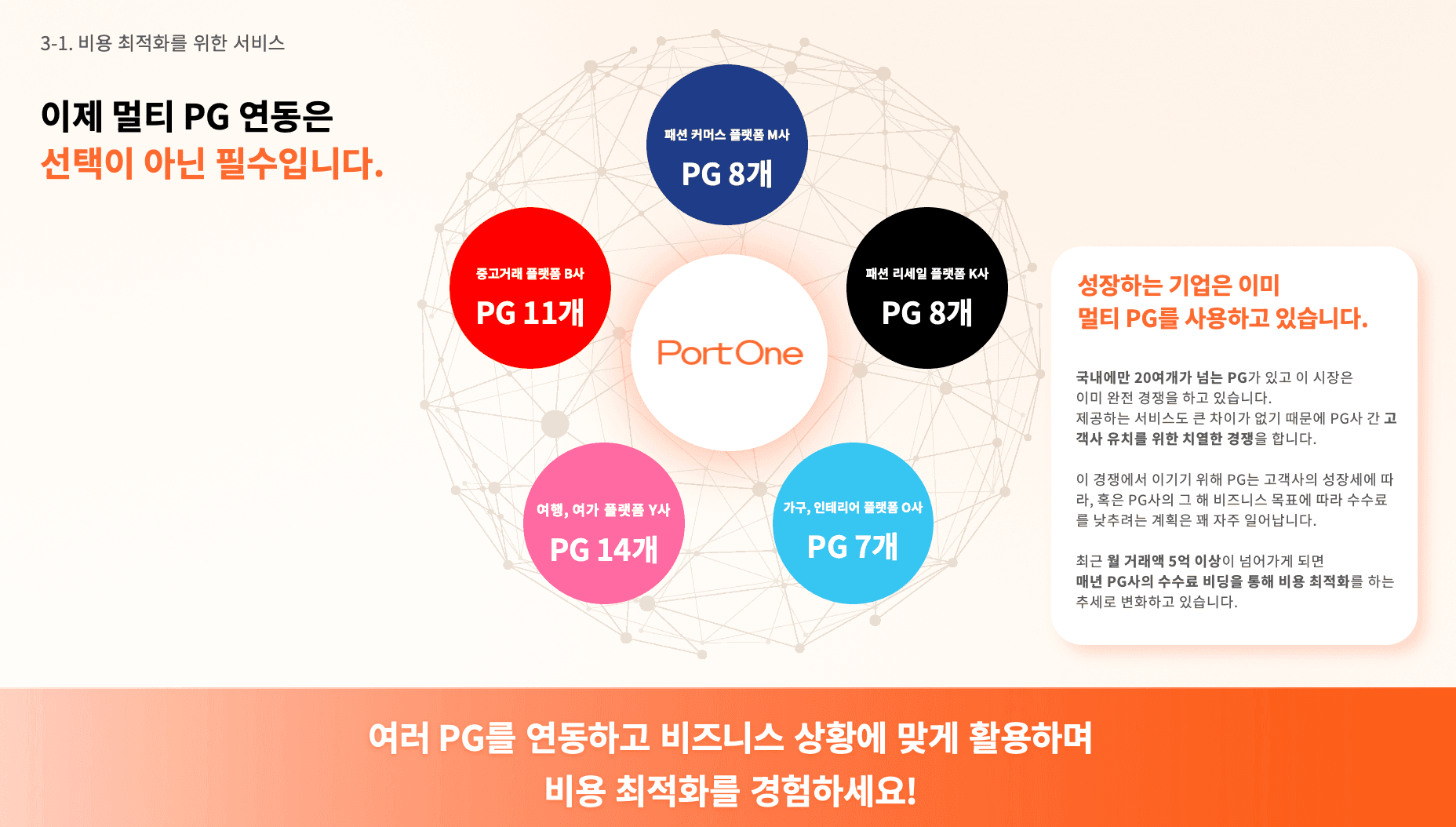 성장하는 기업들은 이미 멀티 PG를 사용 중! 손쉬운 멀티 PG 연동, 이제 누구나 가능합니다.