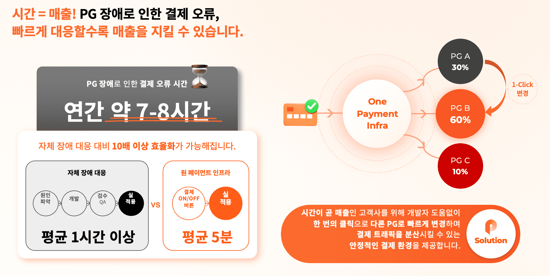 말 그대로 결제 장애는 매출의 장애로 이어집니다. 기존의 1개 PG사로 결제를 연동한 고객사는 해당 PG사의 문제가 발생했을 시 어떤 해결책없이 장애가 해소될때까지 기다리는 방법밖에 없었습니다. 실제로 조사에 따르면 PG 장애는 연간 약 7-8시간이라고 하는데요, 가장 성수기에 특히 골든 타임에 장애가 터진다면 해당 매출 포기는 물론 고객이탈까지 각오해야 합니다. 큰 규모의 기업들이야 어떻게든 자체 장애 대응을 준비해볼 수 있겠지만, 상대적으로 작은 규모의 기업들은 그런 리소스를 갖추기도 어려운 현실입니다.