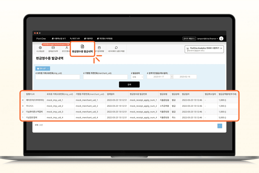 계좌이체 진행 시 발급되어야 하는 현금영수증 발행 내역을 확인할 수 있습니다. 포트원 연동을 통해 결제된 거래에 대한 발행건뿐만 아니라 별도로 처리된 현금 결제 건(가맹점 자체 거래건)에 대한 내역까지 조회할 수 있습니다.