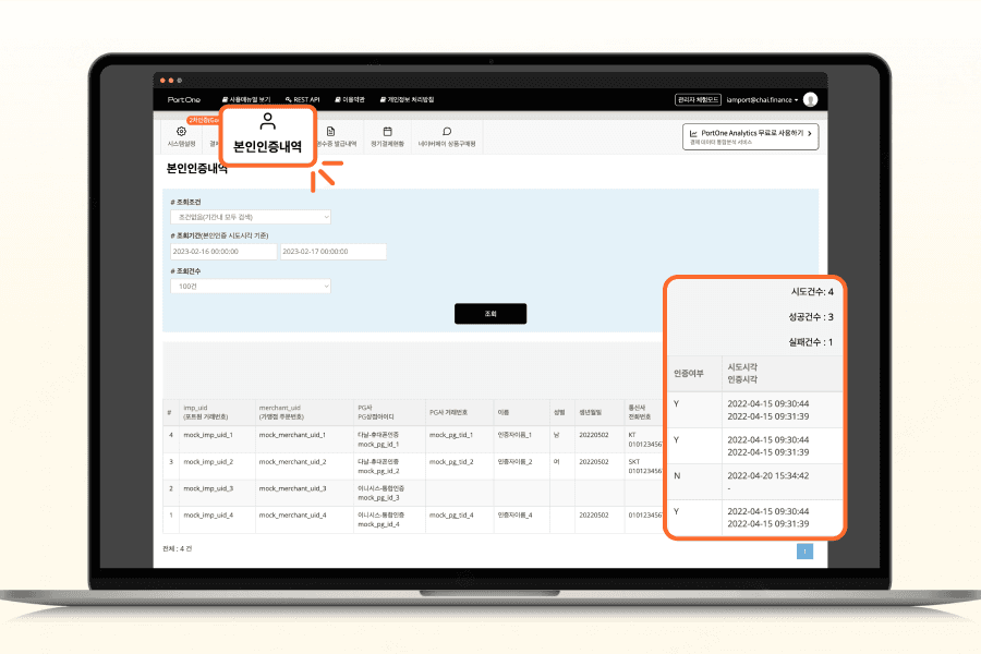 휴대폰, 신용카드, 통합인증 등을 통해 본인인증을 진행한 내역을 확인할 수 있습니다. 인증한 고객의 정보와 통신사 정보, 인증 여부, 인증 시간 등을 확인할 수 있습니다.
