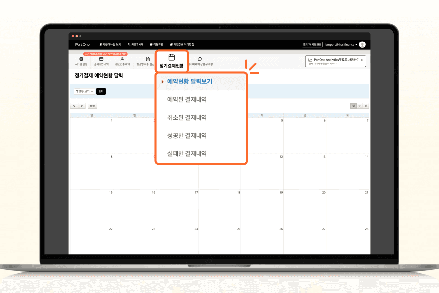 포트원을 통해 정기결제(빌링결제)를 이용할 경우, 예약 현황 및 상세 내역을 확인할 수 있습니다. 월별, 주간, 일자별 캘린더와 전체 목록을 제공해 편리하게 내역을 관리할 수 있습니다.